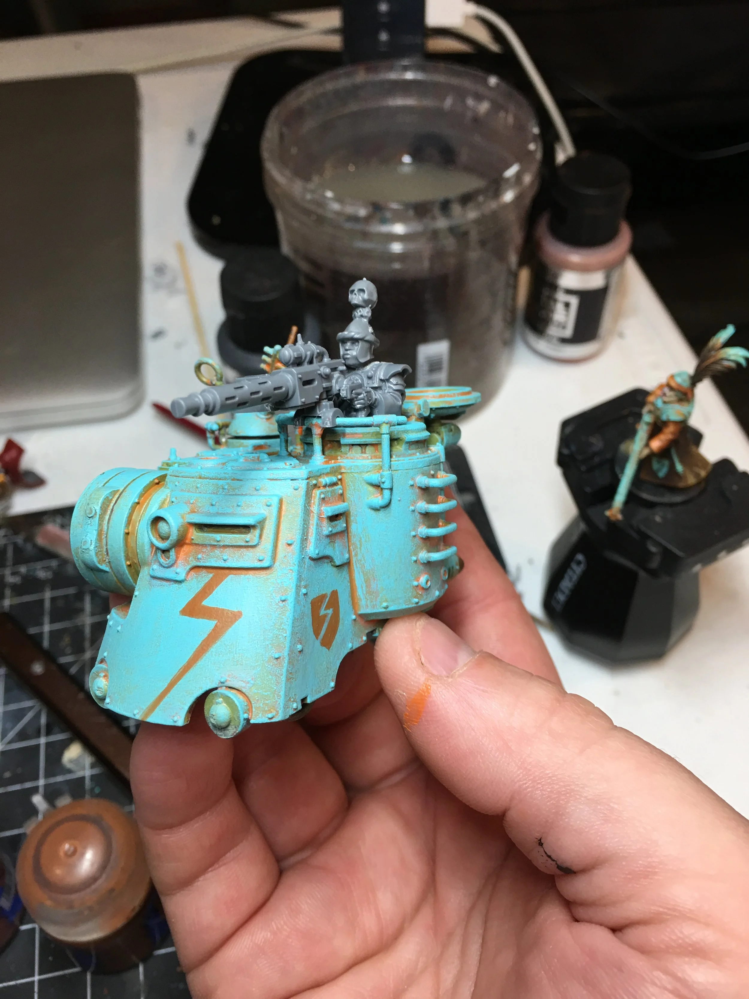 A E44D cog tanks differ from other tanks in the Ironweld arsenal, favoring walking locomotion over wheels, allowing them to traverse through more environments across the mortal realms. The Quadrupedal arrangement of this cog tank is very suitable for the jungles of Ghyran that they find themselves in.
