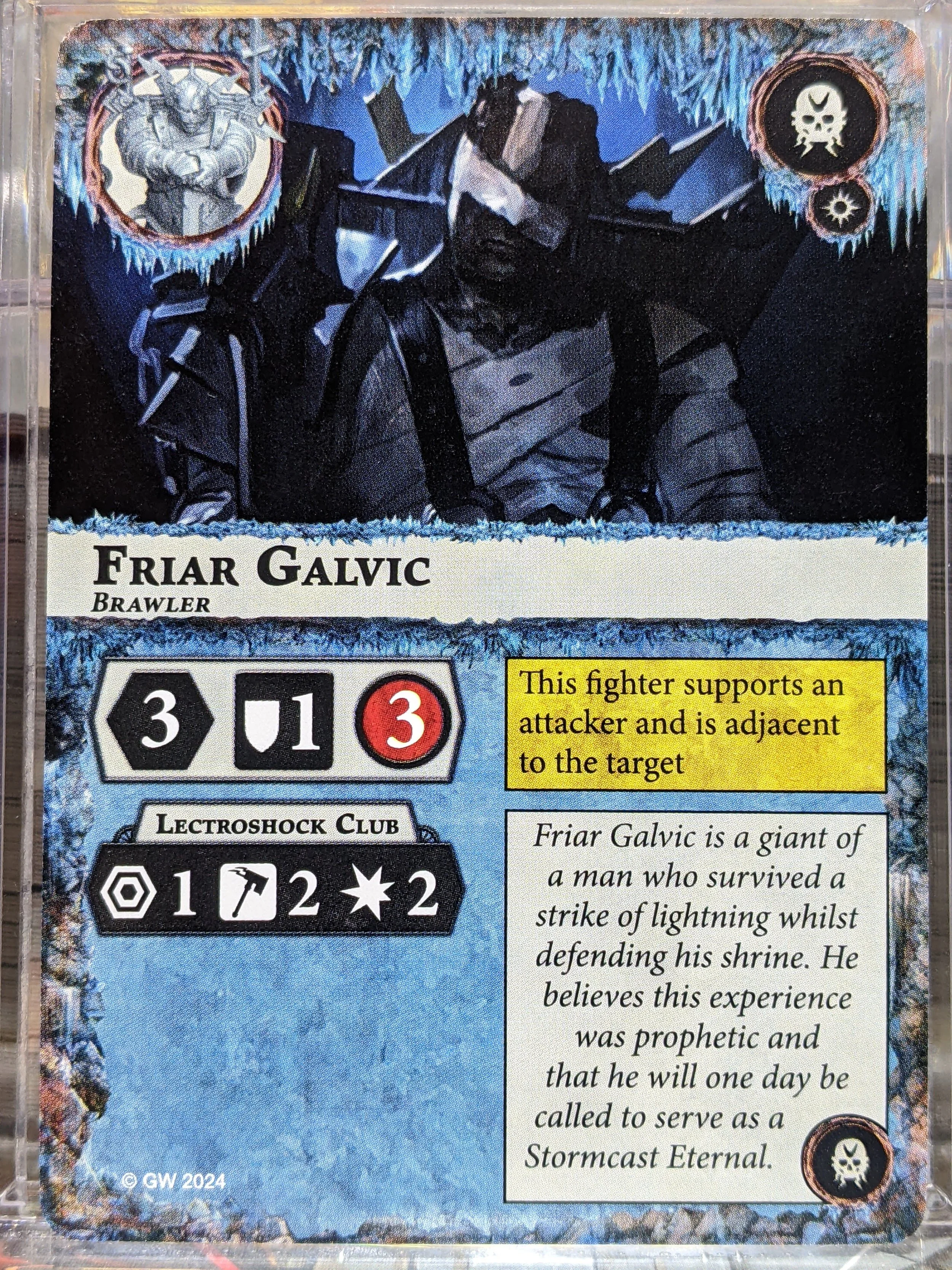D: Kinda like Pater Filius' inspired attack action with the modest bonus of Knockback. Good accuracy to start on this crew could be scary to some warbands that are counting on defensive dice more than health to live. Brawler if that keyword starts getting called out on the regular again.