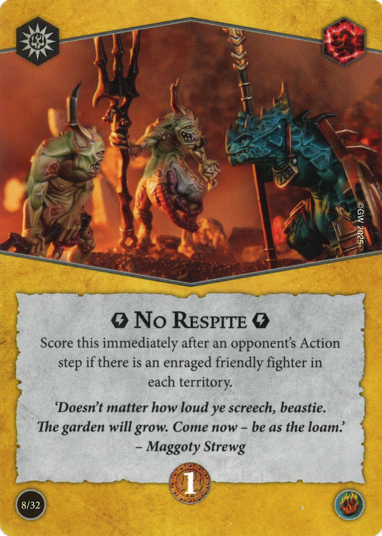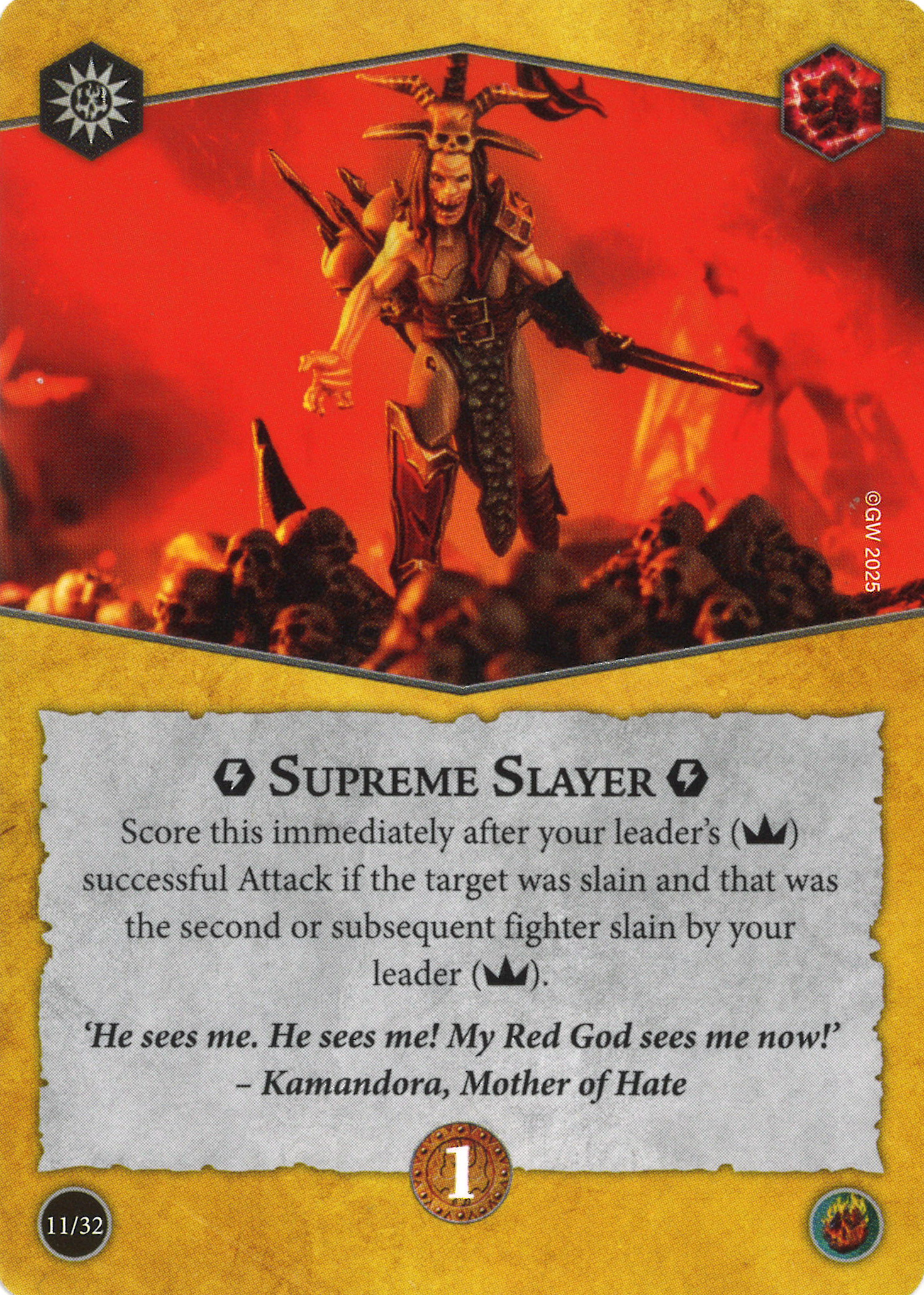 P: Slaying? Most likely. Raging? Absolutely, no question. Either because of the unchecked charging or completely checked scoring! This deck offers some serious aggro potential paired with a pretty hefty anchor of an objective deck. If the right pairing can be found to truly take advantage of those innate rerolls the Underworlds will have to watch out.