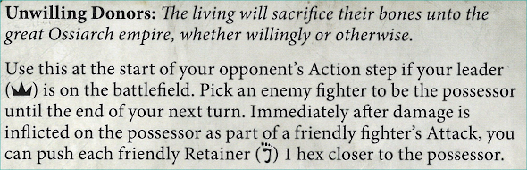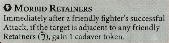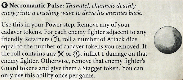 Z: Another way to spend those precious cadaver tokens. I think this is the first ability this edition to remove an enemies guard token. That alone makes both sides of this attractive. Though you know you'll get the ping when you need to get rid of a guard and then only end up with a stagger when you need that killing ping. The for each enemy fighter clause makes this potentially very interesting, but it will require a dangerous position for those important retainers.