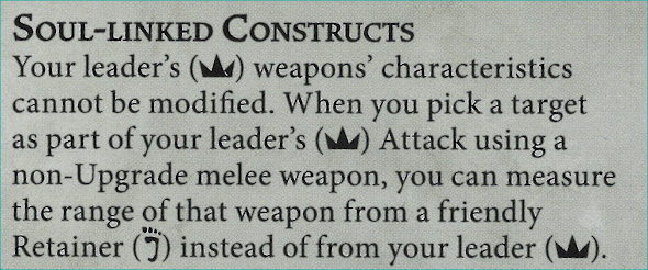 D: Not that it's easy to modify ranged attacks in general, but I'm not sure why he can't modify his ranged attacks if his melee attacks are the only ones that can channel through his retainers. You'll see that melee attack starts pretty darn modest, so despite being very unique, there's only so far you can take this. But you absolutely *should* take another look at cards that interact with this in interesting ways. Score Aggressive Defender with your leader while being nowhere near the target! Score Lead by Example from the safety of your back line. So on and so forth. This feels like the ability that might have a lot of skill expression available.