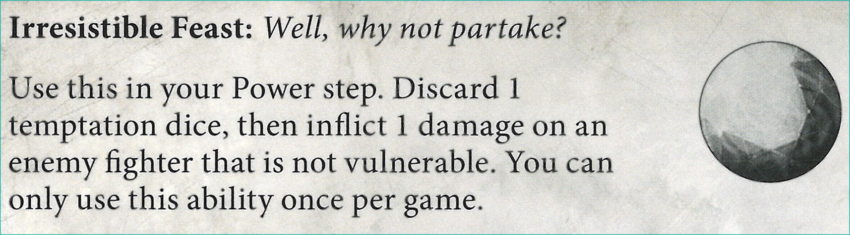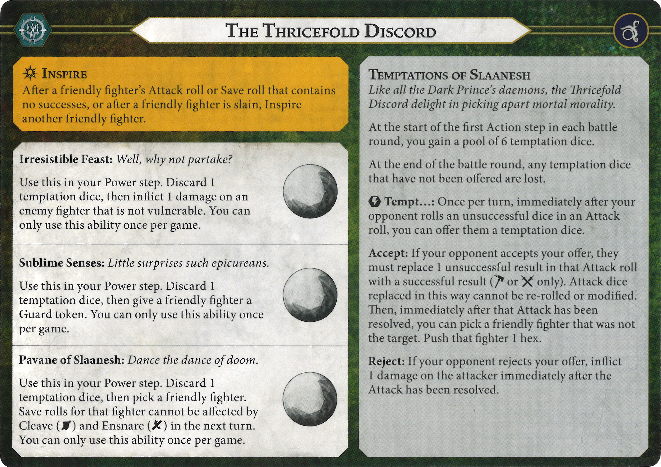 D: While six is a thematic number, it seems like an almost comically large number of dice to use *each* battle round. You can cover every action step attack with a few to spare on out of sequence attacks (volley, improvised attack) or the other three abilities. The timing is interesting here. You trigger the Tempt ability before any defense dice have been rolled. I see a few scenarios: