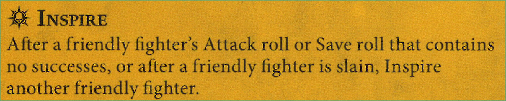 D: There's a fair amount to like out of this inspire too. Very good accuracy boost and defensive boost. Crit grievous is more about the threat than the reliability. Scary when paired with warscroll's pings.