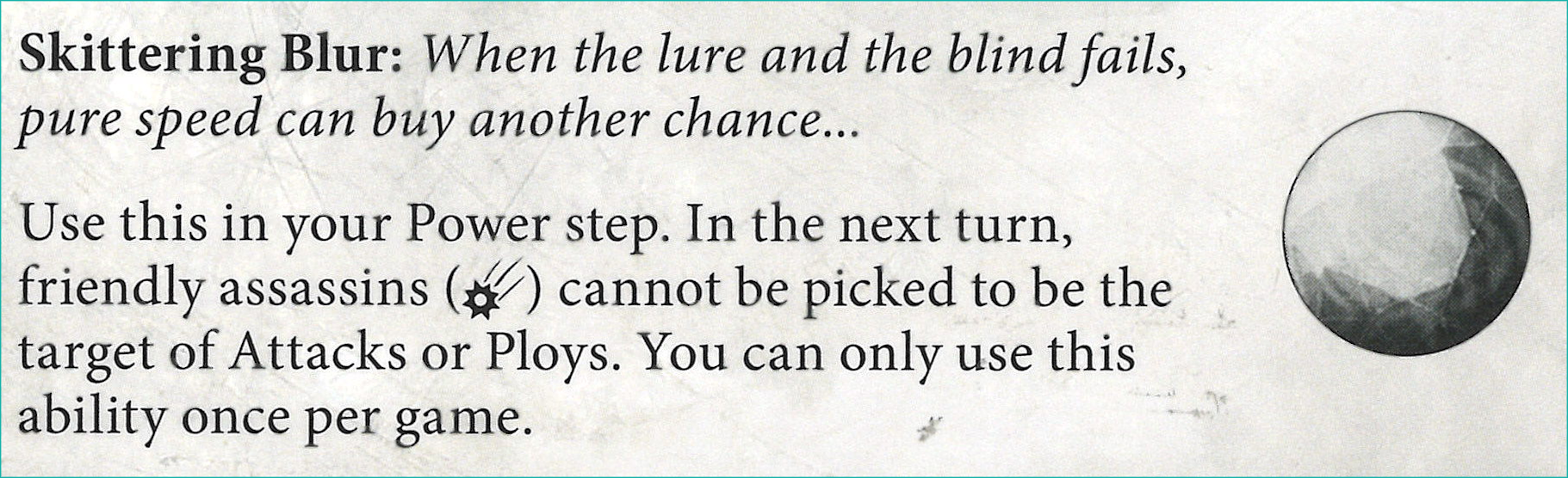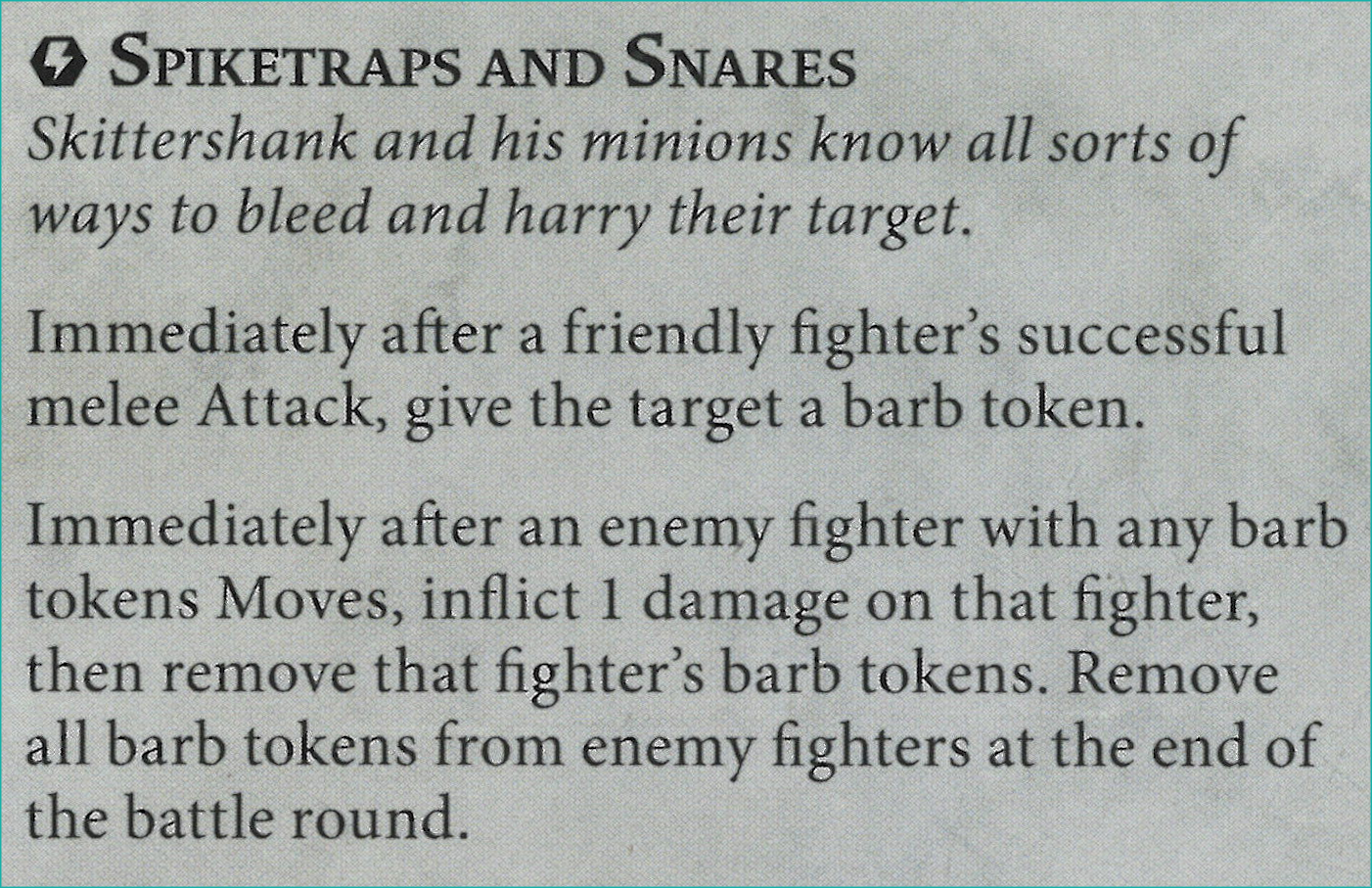 Z: The barb token staying for the whole round seems crazy strong considering we just saw Kammandora. View this as either +1 damage on your melee weapons or the target doesn't get to move for the rest of the round.