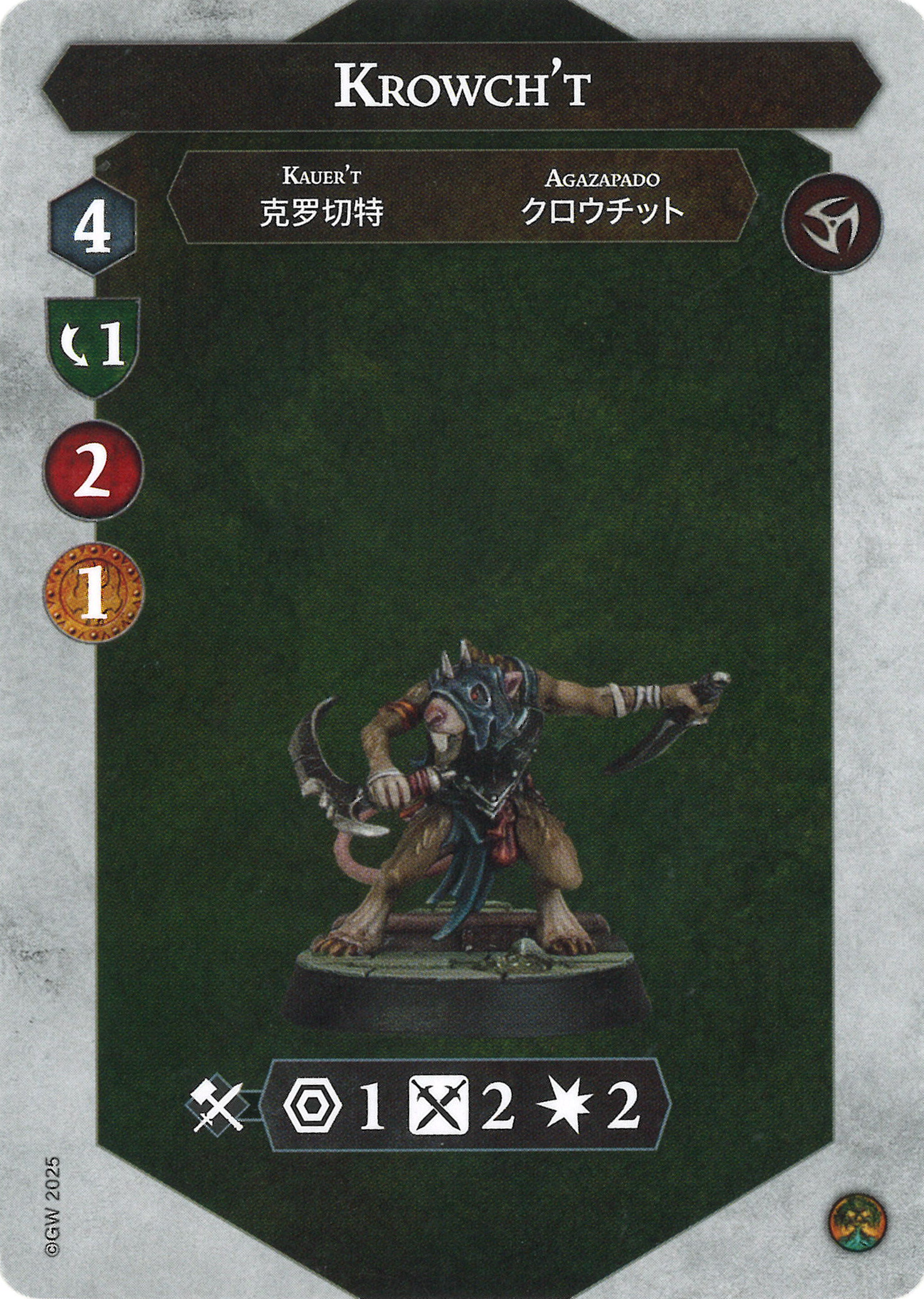 Z: The re-roll means this attack isn't as bad as it looks on the surface. 2 damage and a barb on what essentially amounts to a 50-50 is a tantalizing prospect and one I'd certainly try to avoid on the other side. The 1 dodge defense and 2 health does mean he will just explode to the slightest effort, so be careful to not leave him out in the breeze if you intend to get something out of him.