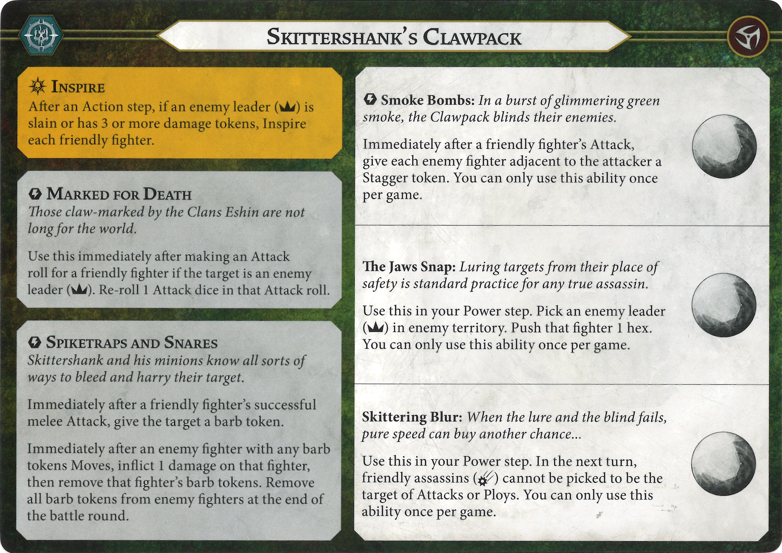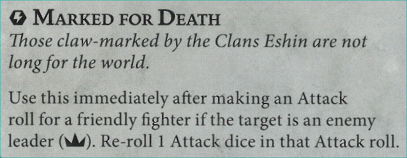 Z: Another ability that belonged to a single fighter last edition that can be used with anyone now. I think you pop this early since that'll be the most likely time to get multiple staggers. Double up on re-rolls against the enemy leader for maximum early assassination chances.
