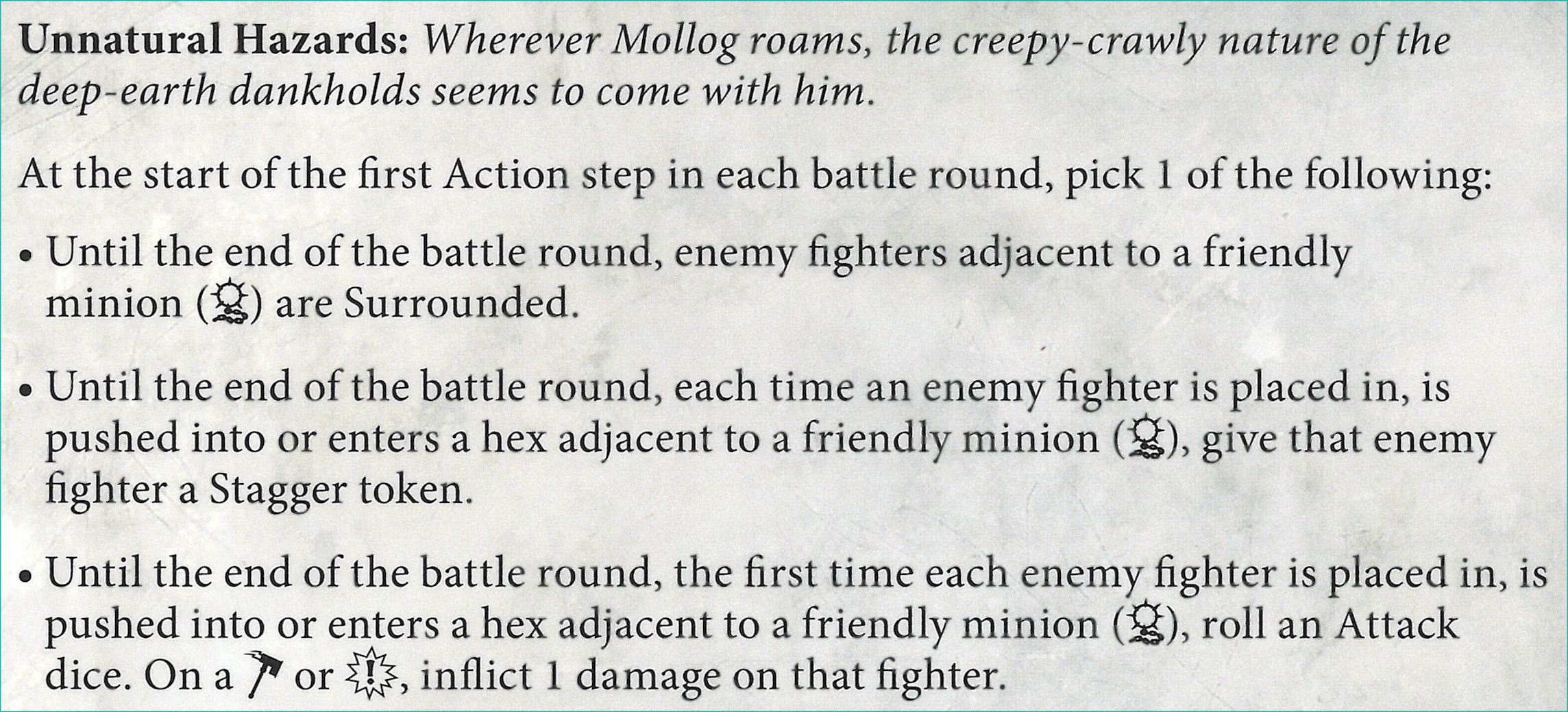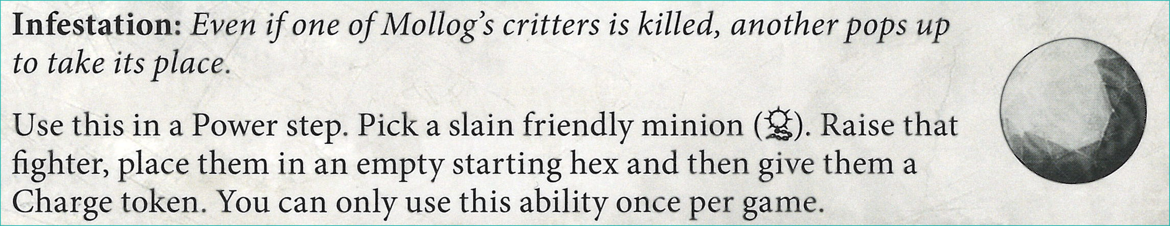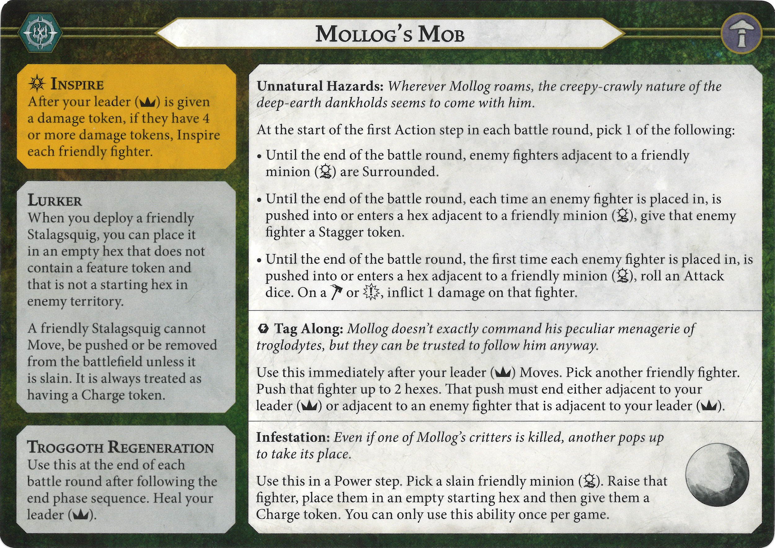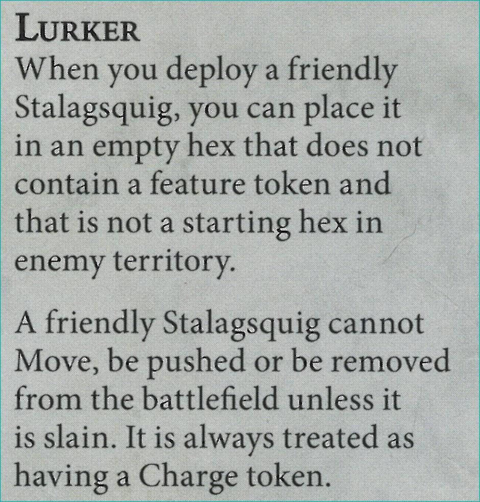 D: Stalagsquig works pretty clearly here. But wait- always treated as having a charge token?! He's not holding his squad back from getting charged out? Yowza. It does mean he can't make cheeky early attacks (looking at you Slippy) but I think most Mollog players happily take that trade-off.
