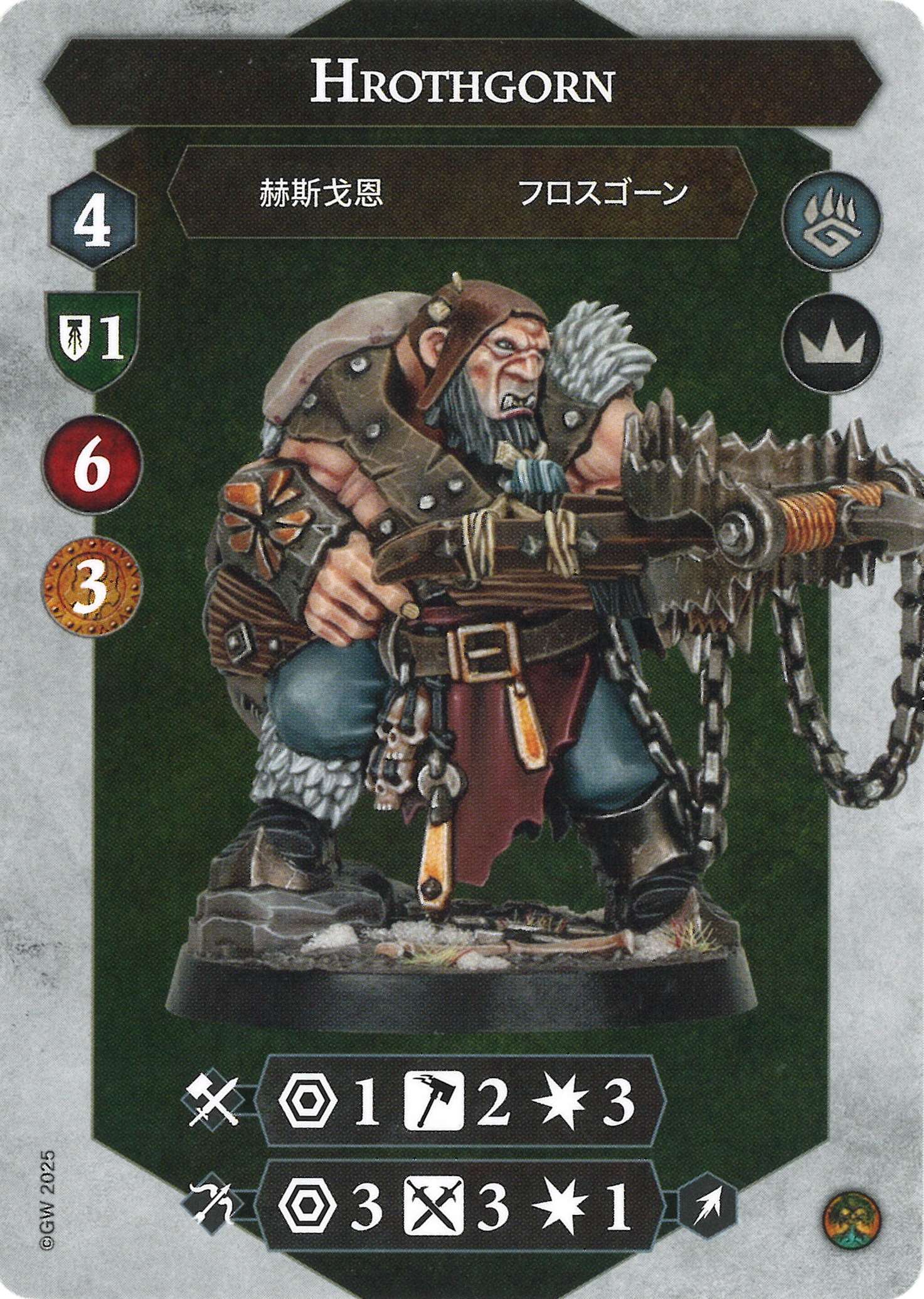 P: I believe this is identical to first edition, and that is no bad thing! Hrothgorn has always been a monster in melee once you get him there and the 4 move is always a bit shocking on such a large fighter. He has to do a lot of work solo though so it makes sense that he has such strong stats.