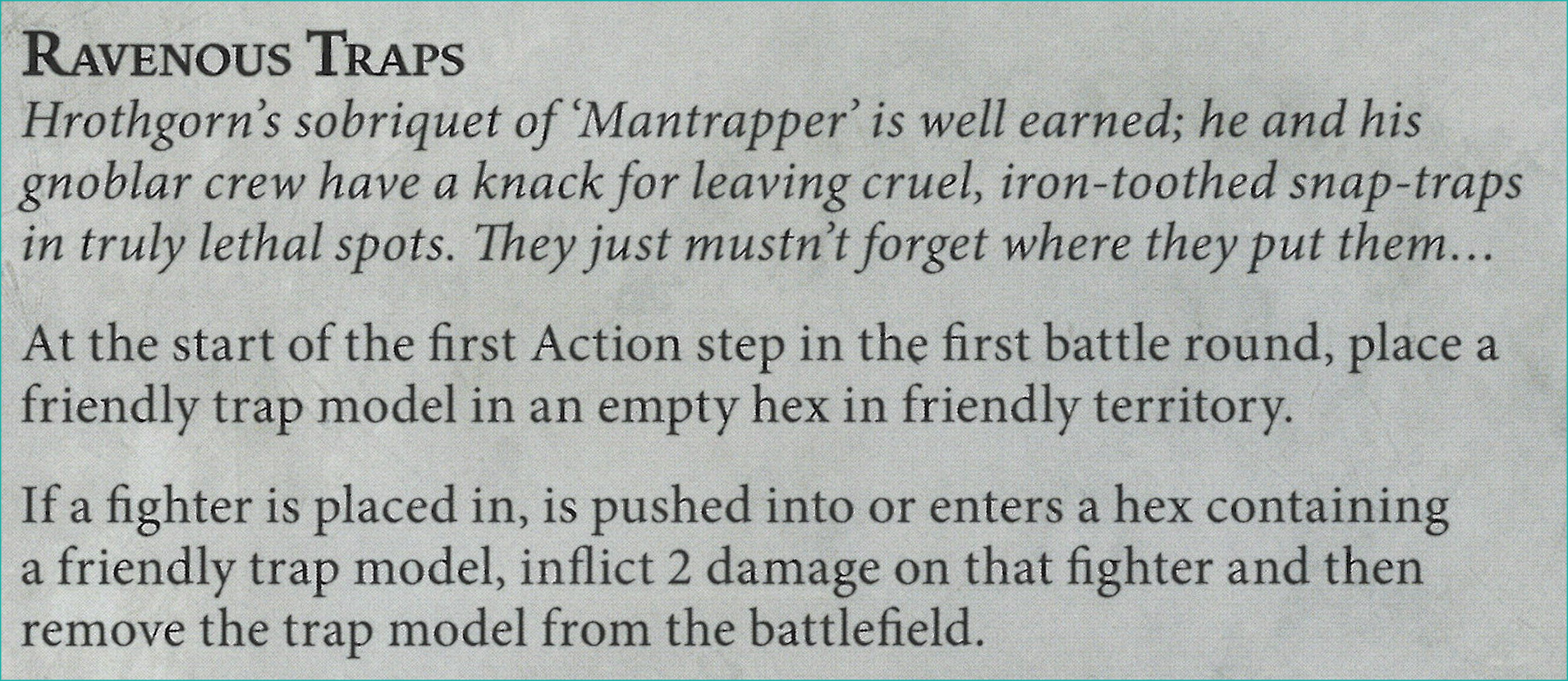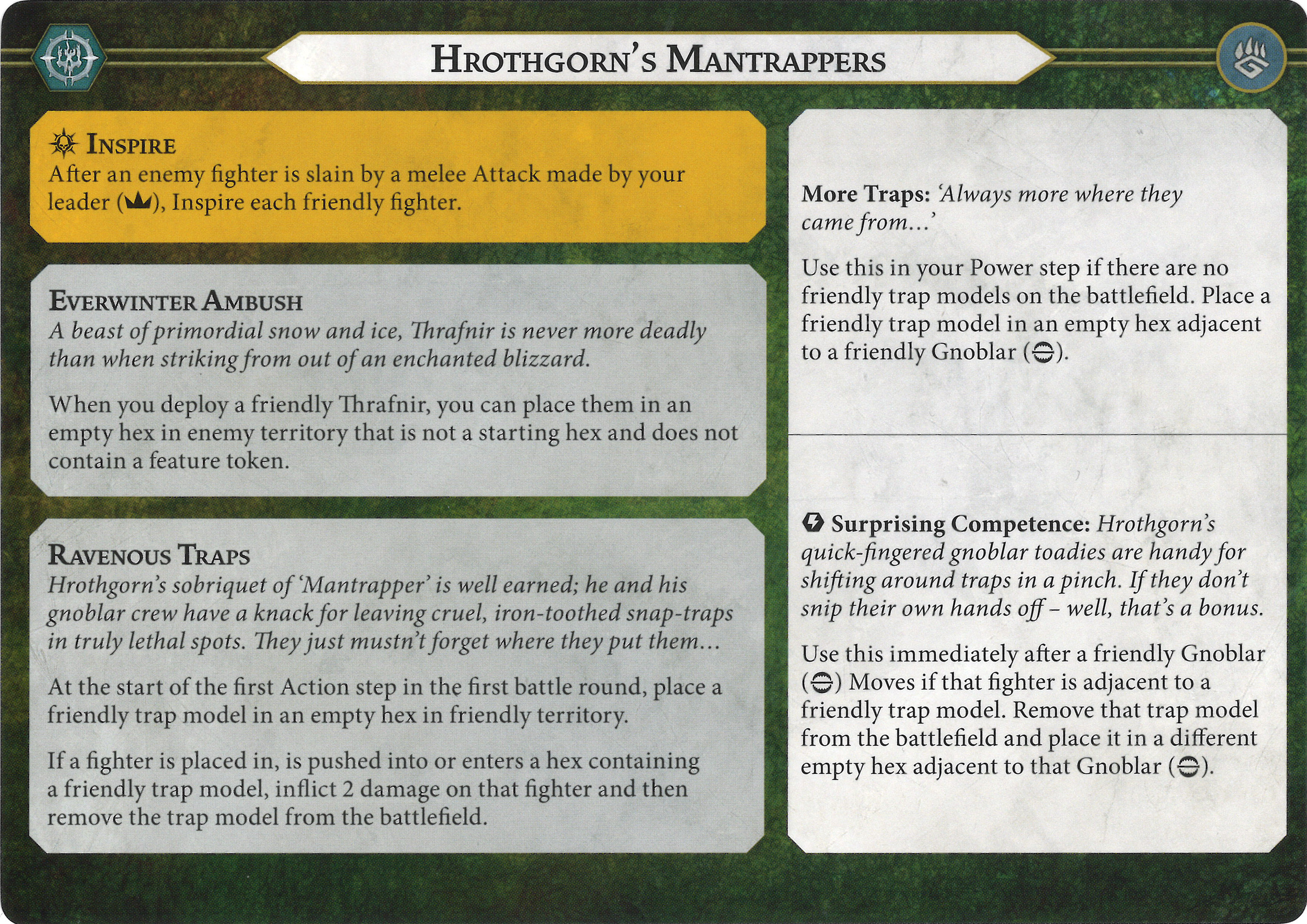 S: Everwinter Ambush and Ravenous Traps together really invoke this feeling of being tracked and hunted. Looking quite forward to seeing where these two placements occur game after game. I hope this is a warband I get to see a bunch.