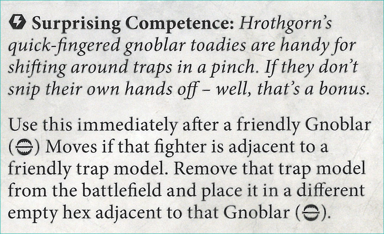 P: I'm not so sure about this one... Being able to reposition the trap is nice, but needing to do so as part of a move from a grot is not amazing and then needing to place it adjacent to that grot feels like asking to get that grot pushed into the trap next activation. Maybe there is something you can do with charging and repositioning the trap at the same time that could be good but I'm struggling to see it. I'll need to play with this one a bit.