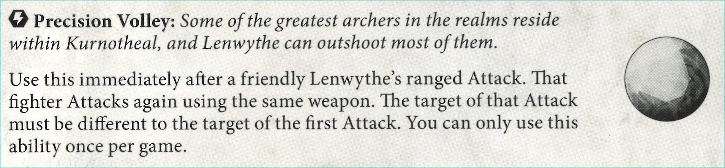 S: But here, here I'll complain. Lenwythe is not offering much on her own as a fighter. She's a utility piece. It would have been rad if she had full choice of who to target with a follow up bow shot and possibly get a second chance at moving a target you failed to move on the first shot. The ability is fine, but doesn't stand out or do much to help set this warband apart from the rest of the warbands available today.