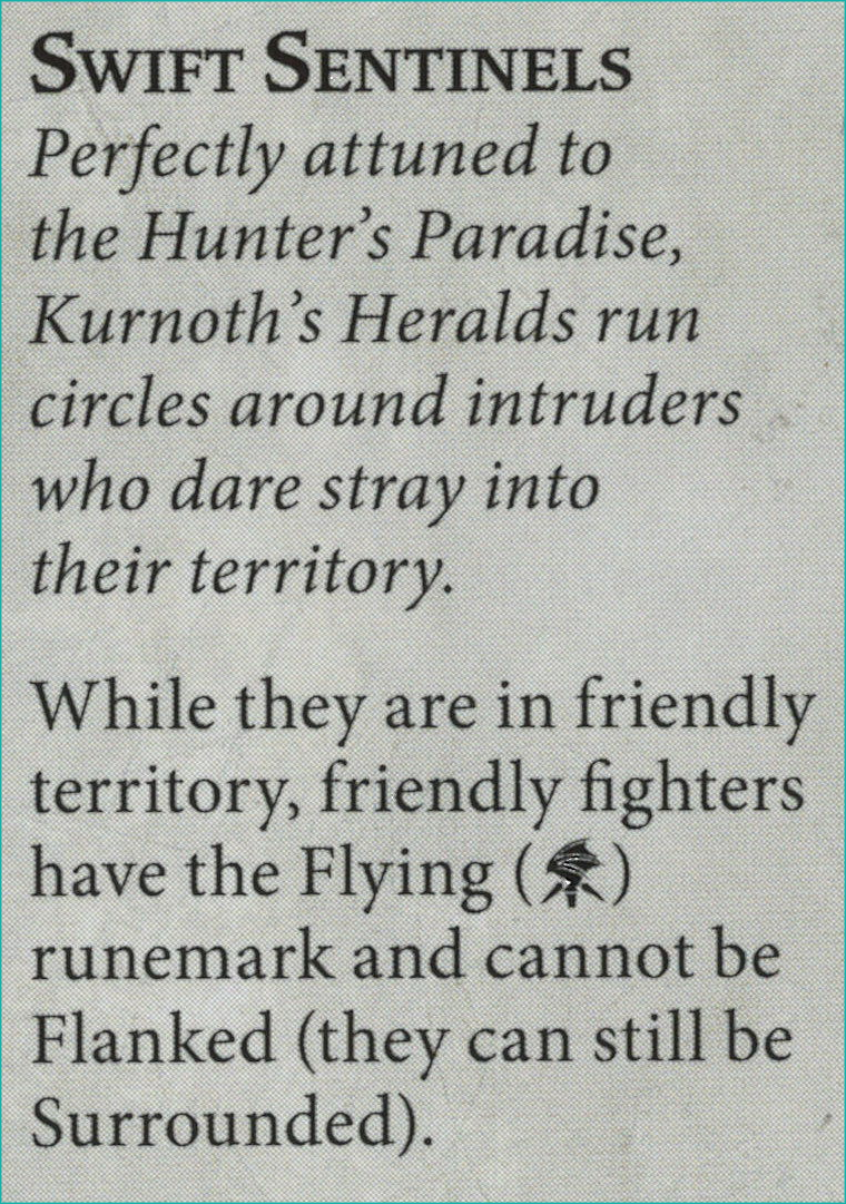 S: Having some caveated access to Flying helps realize a Speed motif I'm surprised is absent otherwise. (Looking at these models, you'd assume at least one of them hits 5-Speed.) But the thing I especially like in Swift Sentinels is the home territory guardians feeling invoked by not being able to be Flanked in friendly territory. Love that.