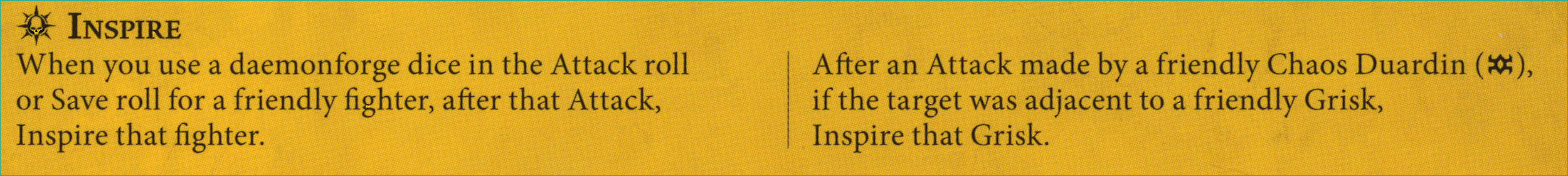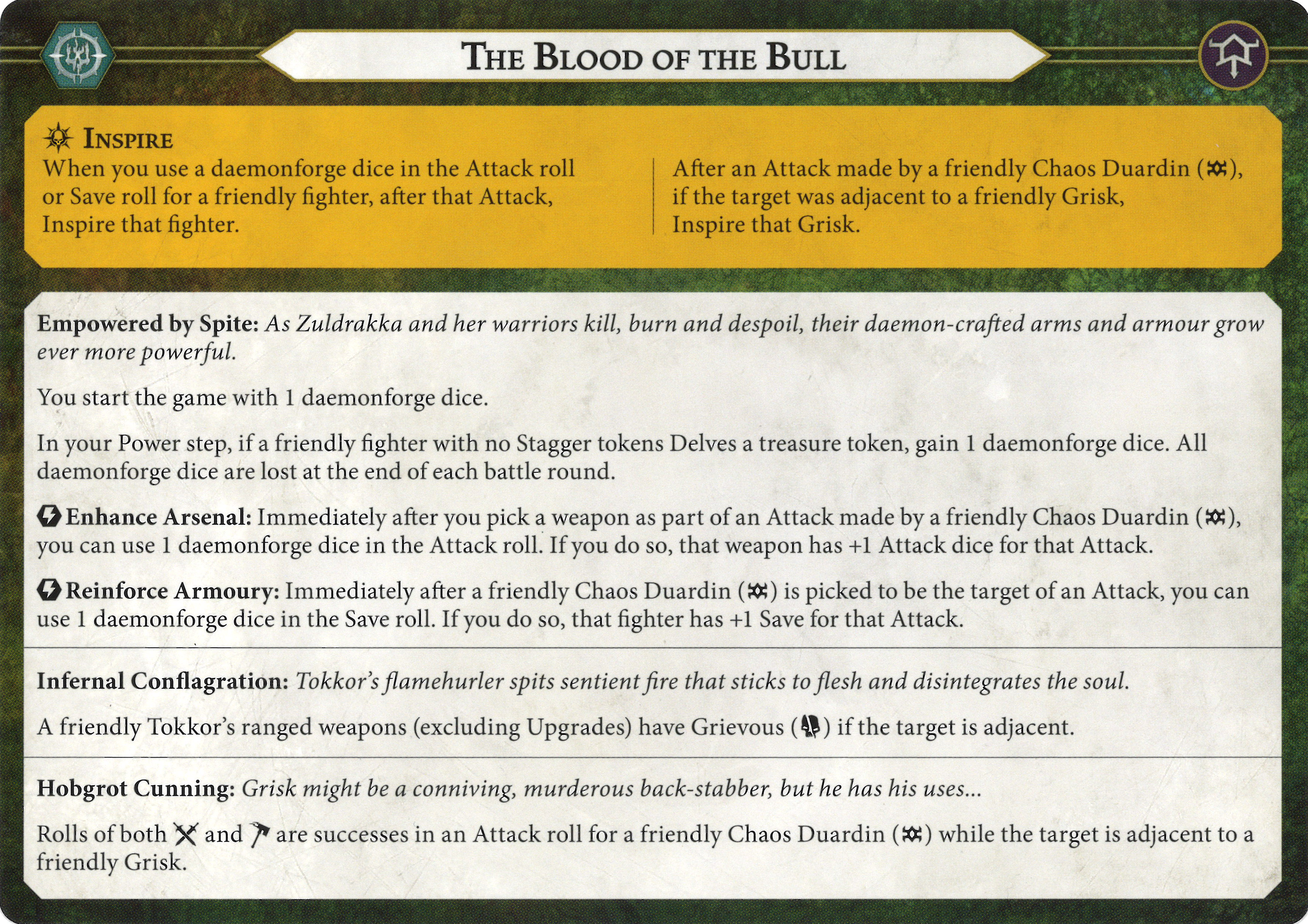 D: The meat and potatoes of this warscroll. These daemonforge dice are really, really great. On demand extra die that *also* inspires a fighter. And looking ahead, these are inspired profiles you *want* to have. I still need to see the collection process in practice, but initially, I like the setup. There's some counterplay available by delving contestable tokens early to make the condition tricky to pull off.